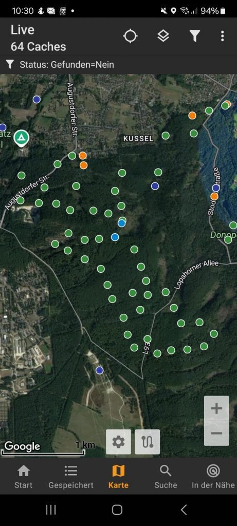 Drei Schleifen, mit jeweils etwa 5km Länge und insgesamt 42 Geocaches (Tradi) plus ein paar weitere Geocaches auf dem Weg (Earthcaches + andere). Ob und wie wir diese drei Schleifen angehen sollten? Keinen Plan, wir hatten uns ja wirklich spontan entschieden und so haben wir das für uns Naheliegendste getan: Den besten Parkplatz gesucht und dort gestartet.